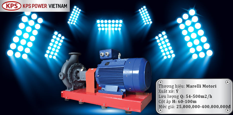 Bơm chữa cháy điện Marelli Motori ( thường đi kèm đầu bơm Kirloskar, Ebara và Pentax): Thương hiệu Ý, Lưu lượng Q: 54-500m2/h, cột áp H: 60-100m. Mức giá tầm 25,000,000-400,000,000đ