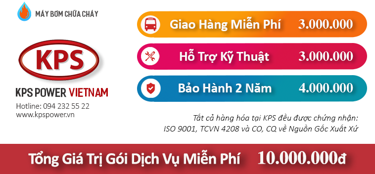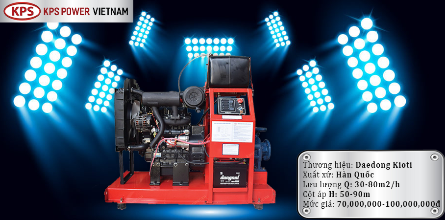 Bơm chữa cháy Daedong Kioti: Xuất xứ Hàn Quốc. Lưu lượng Q: 30-80m2/h, cột áp H: 50-90m. Mức giá tầm 70,000,000-100,000,000đ