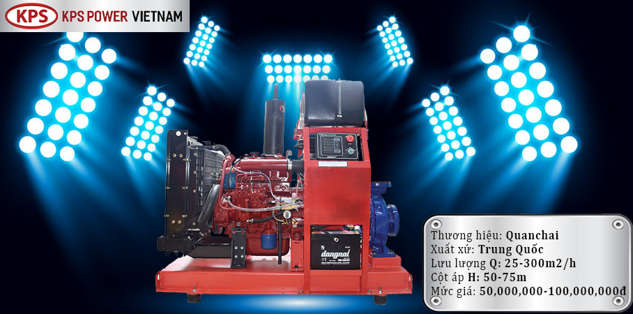 Bơm chữa cháy Quanchai: Thương hiệu nổi tiếng Trung Quốc. Lưu lượng Q: 25-300m2/h, cột áp H: 50-75m. Mức giá tầm 50,000,000-100,000,000đ