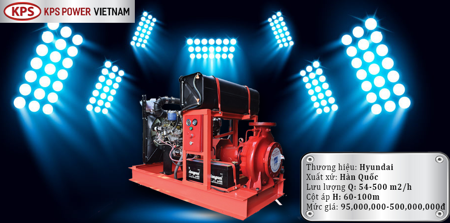 Bơm chữa cháy Hyundai: Là dòng thương hiệu máy bơm chữa cháy nổi tiếng Hàn Quốc. Lưu lượng trong khoảng Q: 54-500 m2/h, cột áp H: 60-100m. Mức giá tầm 95,000,000-500,000,000đ